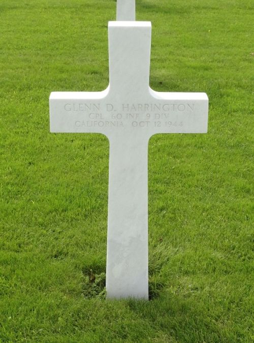 Cpl Glenn D. Harrington was a construction worker before he enlisted in Los Angeles, California on 5 November 1942.Source of information: Peter Schouteten, Carla Mans, www.abmc.gov, www.wwiimemorial.com, www.archives.gov - WWII Enlistment Record, www.ancestry.com - Headstone and Interment Record / 1940 Census / U.S. WWII Draft Cards Young Men, http://9thinfantrydivision.net