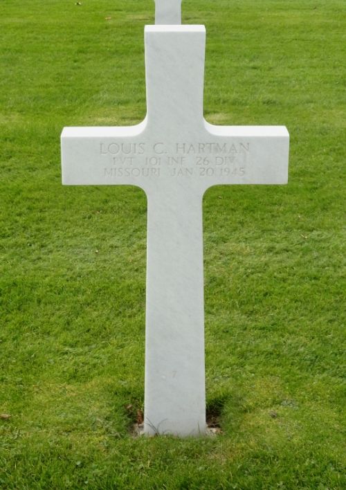 Pvt Louis C. Hartman enlisted in Jefferson Barracks, Missouri on 20 May 1944 and received his training at Camp Roberts, California. Formerly employed by the Farm Bureau Service Company in Palmyra.He was first buried at Temporary American Military Cemetery Foy, Belgium Block B, Row 6, Grave 128.