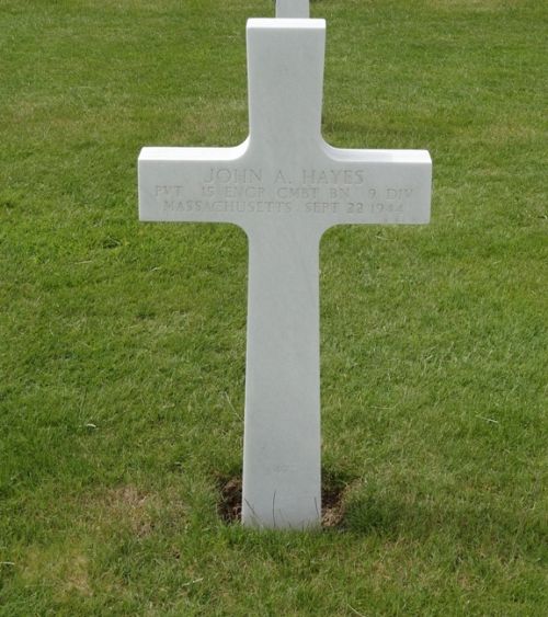 Pvt John A. Hayes was a sales clerk before he enlisted in Boston, Massachusetts on 19 February 1941.He was first buried at the Temporary American Military Cemetery of Fosse, Belgium.