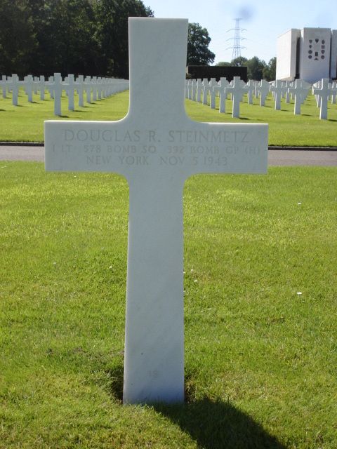 1st Lt Douglas R. Steinmetz graduated from Flushing High School and attended college for one year. He was employed as a jewelry salesman at the Louis Franklin Company.According to the statement of 1st Lt Robert M. Robinson the airplane was seen below the formation, in trouble. One observer reported the plane being followed down by an enemy aircraft and stated that the B-24 was in flames. In all, four parachutes were seen to open.