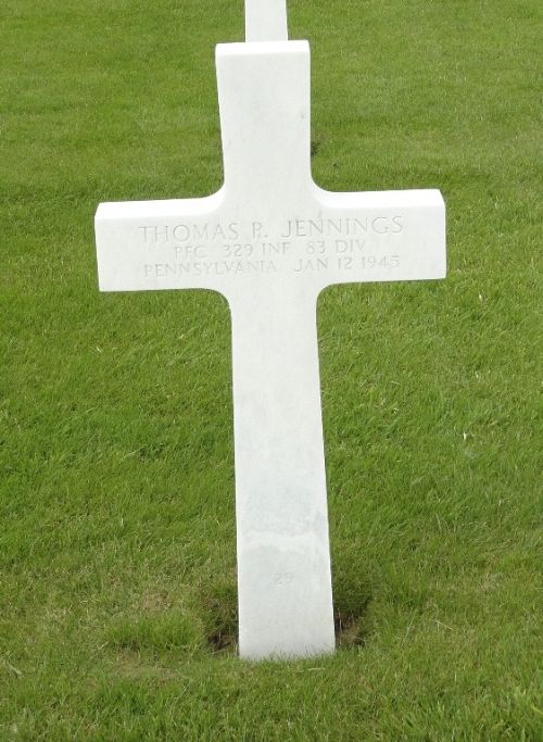 Pfc Thomas P. Jennings attended high school for three years and was an attendant in a recreation and amusement park before he enlisted in Wilkes Barre, Pennsylvania on 8 December 1943.Source of information: Peter Schouteten, Carla Mans, www.abmc.gov, www.wwiimemorial.com, www.archives.gov