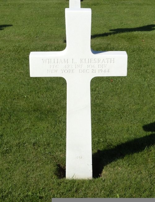 Pfc William L. Kliesrath was a music teacher before he enlisted in New York City, New York on 20 April 1943.He was first buried at the Temporary American Military Cemetery of Foy, Belgium.