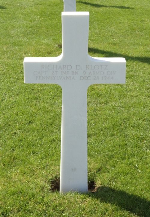 Capt Klotz was first buried at Temporary American Military Cemetery Henri-Chapelle, Belgium Block QQ, Row 6, Grave 106.