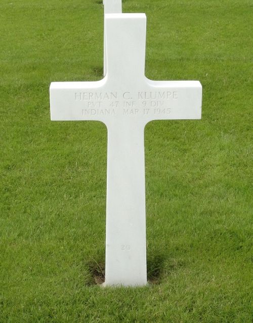 Pvt Herman C. Klumpe enlisted in Indianapolis, Indiana on 4 September 1944.Source of information: Peter Schouteten, Carla Mans, www.abmc.gov, www.wwiimemorial.com, www.archives.gov – WWII Enlistment Record, www.ancestry.com - Headstone and Interment Record / U.S. WWII Draft Cards Young Men / 1940 Census, http://9thinfantrydivision.net