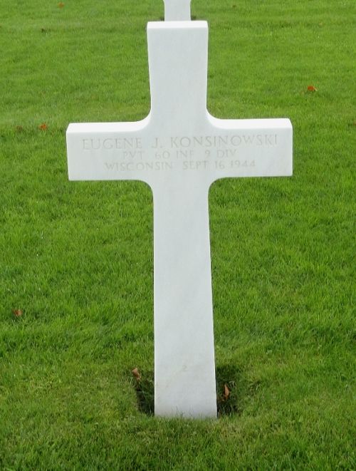 Pvt Eugene J. Konsinowski attended William Horlick High School and was an employed at the Western Printing & Lithographing Co. before he enlisted in Milwaukee, Wisconsin on 30 November 1942.Pvt Eugene J. Konsinowski was first buried at the Temporary American Military Cemetery of Fosse, Belgium.