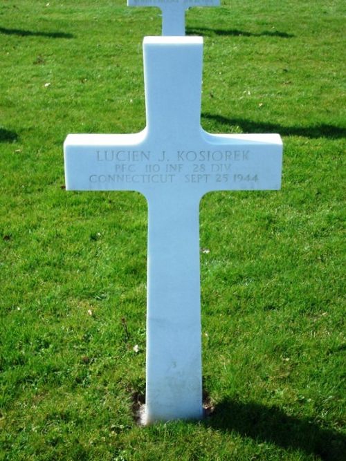 Pfc Lucien J. Kosiorek enlisted in Hartford, Connecticut on 2 March 1943.His initial burial took place on Fosse Cemetery, Namur, Belgium.