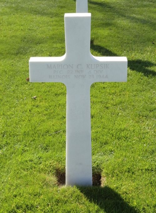 Pfc Marion C. Kupsik enlisted in Chicago, Illinois on 28 February 1942.Source of information: FOHF, www.abmc.gov, www.wwiimemorial.com, www.archives.gov - WWII Enlistment Record, www.ancestry.com - U.S. Headstone and Interment Records for U.S. Military Cemeteries on Foreign Soil / 1930 Census