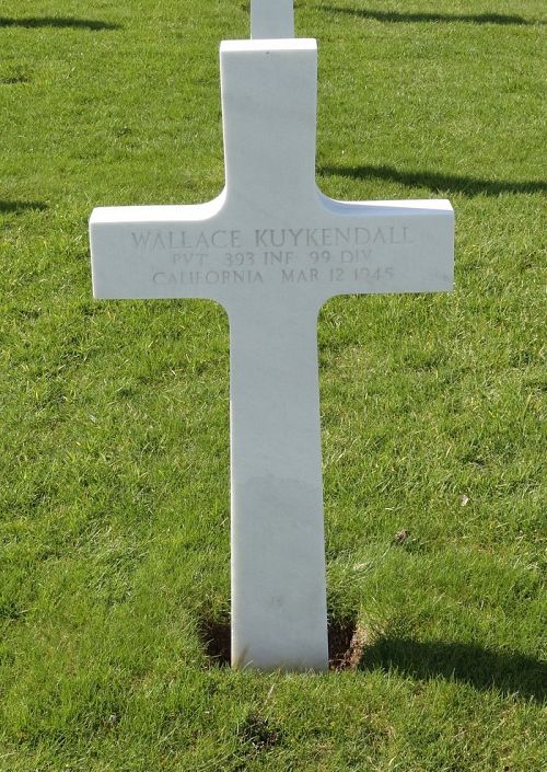 Pvt Wallace Kuykendall completed two years of college and was working at Solar Aircraft Company when he enlisted in Los Angeles, California on 27 October 1942.Source of information: Peter Schouteten, Carla Mans, www.abmc.gov, www.wwiimemorial.com, www.archives.gov - WWII Enlistment Record, www.ancestry.com - Headstone and Interment Record, www.findagrave.com - Lillian Published in The Carnegie Herald - 18 April 1945