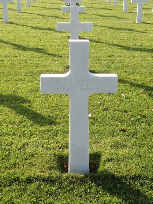 Pfc Archie Lavasseur Jr. was lightly wounded in action on 16 July 1944 and rejoined his unit four days later. For this wound he was awarded the Purple Heart Medal a first time.He was first buried at the Temporary American Military Cemetery of Foy, Belgium.