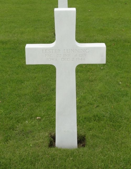 Pfc Lester Lunning graduated from Radcliffe High School and attended Iowa Aircraft School. He worked at Hayes Manufacturing in Grand Rapids, Michigan, making airplane wings. During his six month residency in Grand Rapids, he met and married his wife, Celia Ann.He enlisted on 4 December 1942 and was sent overseas in January 1944.