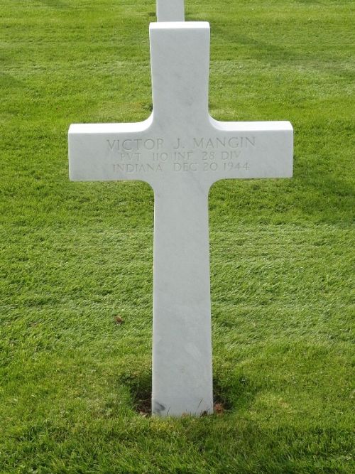 Pvt Victor J. Mangin enlisted in Evansville, Indiana on 20 October 1943.Pvt Victor J Mangin was killed together with 5 other soldiers (Hahs, Thorpe, Binder, Callen, and Hudzinski) by a German 88 mm shell.