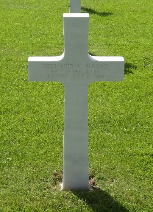 Pfc Richard A. Masko was first buried at the Temporary American Military Cemetery of Fosse, Belgium.Source of information: Danny van der Groen, www.abmc.gov, www.wwiimemorial.com, www.ancestry.com – U.S. Headstone and Interment Record for U.S. Military Cemeteries on Foreign Soil