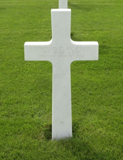 Pvt Lenwood C. McCool was a chauffeur before he enlisted in Portland, Oregon on 13 August 1942.Source of information: Danny van der Groen, www.abmc.gov, www.wwiimemorial.com, www.archives.gov – WWII Enlistment Record, www.ancestry.com – Headstone and Interment Record / Joanna Family Tree / 1930 Census