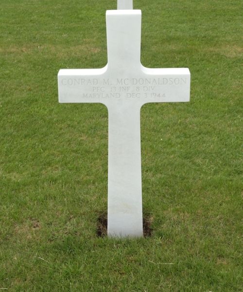 Pfc Conrad M. Mc Donaldson worked in a warehouse before he enlisted at Fort George G. Meade, Maryland on 9 March 1944.Source of information: Raf Dyckmans, Carla Mans, www.abmc.gov, www.wwiimemorial.com, www.archives.gov - WWII Enlistment Record, www.ancestry.com - Headstone and Interment Record / 1930 Census / Pennsylvania Veterans Card, http://cgsc.contentdm.oclc.org - History of the 13th Infantry Regiment, After Action Report of the 13th Infantry Regiment