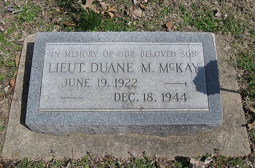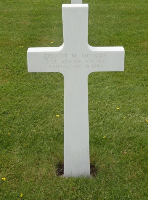 2nd Lt Duane M. Mc Kay enlisted in Syracuse, New York on 1 June 1942.Per Harold Allen: "I was with Lieutenant Mc Kay and others to the right into small trees. We were looking right up the barrel of that big 88. I really figured that was the end. Two men got up in front of us and Lieutenant Mc Kay called to them. They immediately hit the ground. They were German but had on GI overcoats, one could very well have been mine. Lieutenant Mc Kay threw a hand grenade at them. After a couple minutes Lieutenant Mc Kay told us to stay put, that he was going on the other side of the road to try to get a bazooka team up there to knock out the tank. I never heard any details except that he had been killed."