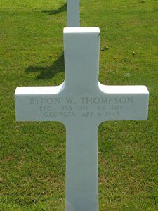 Pfc Byron W. Thompson was training to become a motor mechanic before he enlisted at Fort McPherson on 8 March 1944.Because of his reddish hair, his nickname was "Red".