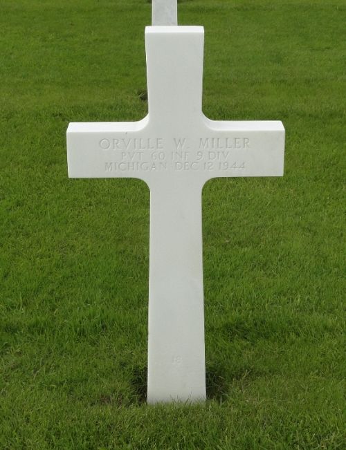 Pvt Miller was wounded in the left arm on 3 August 1944 in France and was sent to a hospital in England. Three of his fingers had to be amputated. He returned to combat duty on 12 November 1944.Source of information: Peter Schouteten, Carla Mans, www.abmc.gov, www.wwiimemorial.com, www.ancestry.com - Headstone and Interment Record / 1930/1940 Census / U.S. WWII Draft Cards Young Men, http://9thinfantrydivision.net, Norma Alexander - Alpena Library Special Collections Dept - courtesy of Susan Linton