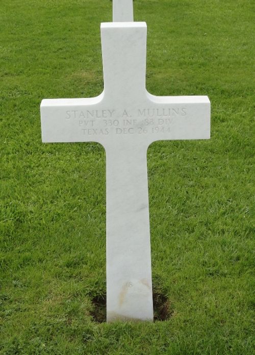 Pvt Stanley A. Mullins joined his unit from a Replacement Battalion on 16 December 1944.He was severely wounded in action on 24 December 1944 and evacuated to the 96th Evacuation Hospital where he died two days later. This Evacuation Hospital was stationed in Brand at that time.