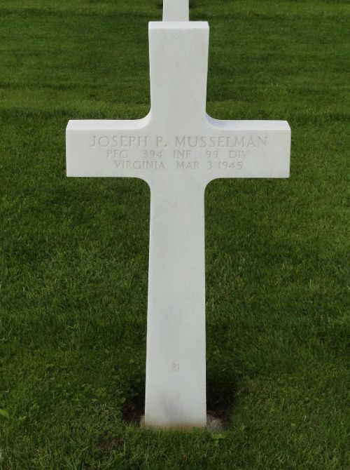 Pfc Joseph P. Musselman was a manager before he enlisted in Roanoke, Virginia on 18 June 1943.Source of information: Peter Schouteten, www.abmc.gov, www.wwiimemorial.com, www.archives.gov – WWII Enlistment Record, www.ancestry.com - U.S., Headstone and Interment Records for U.S. Military Cemeteries on Foreign Soil / Johnson Family Tree / 1930 Census