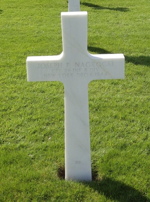 Cpl Joseph F. Nagrocki was a bakrer before he enlisted in Jamaica, New York on 10 April 1941.Source of information: Raf Dyckmans, Carla Mans, www.abmc.gov, www.wwiimemorial.com, www.archives.gov - WWII Enlistment Record, www.ancestry.com - Headstone and Interment Record / U.S. WWII Draft Cards Young Men / 1940 Census, http://cgsc.contentdm.oclc.org - History of the 28th Infantry Regiment, After Action Report of the 28th Infantry Regiment