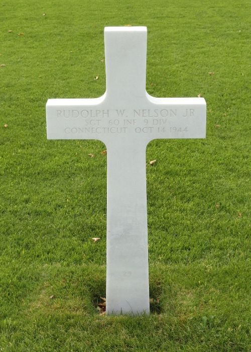 Sgt Rudolph W. Nelson Jr. worked in an aircraft factory before he enlisted in Boston, Massachusetts on 10 May 1943.Source of information: Peter Schouteten, Carla Mans, www.abmc.gov, www.wwiimemorial.com, www.archives.gov – WWII Enlistment Record, www.ancestry.com - Headstone and Interment Record / U.S. WWII Draft Cards Young Men / U.S. Social Security Death Index, http://9thinfantrydivision.net