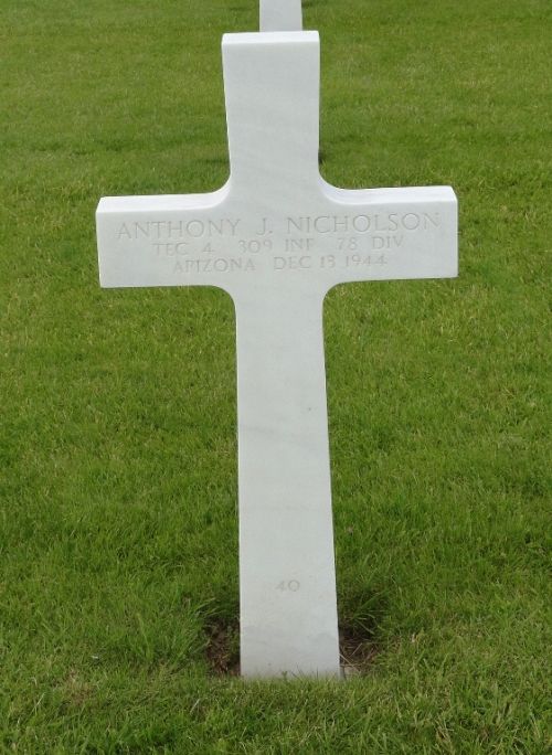 T/4 Anthony J. Nicholson enlisted in Phoenix, Arizona on 10 October 1942. He received his basic training at Camp Barkley, Texas and was assigned to his unit at Camp Buckner, North Carolina before going overseas.He graduated from Bisbee High School and was a miner and mining-machine operator by the Shattuck and Denn Mines before he enlisted.