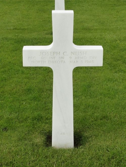 Pfc Joseph C. Nush was first buried at Temporary American Military Cemetery Henri-Chapelle, Belgium Block C4, Row 8, Grave 151.Source of information: Peter Schouteten, Carla Mans, www.abmc.gov, www.wwiimemorial.com, www.ancestry.com - U.S., Headstone and Interment Records for U.S. Military Cemeteries on Foreign Soil / 1940 Census