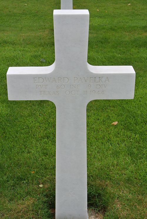 Pvt Edward Pavelka worked on a farm before he enlisted at Fort Sam Houston, Texas on 11 November 1943.Source of information: Peter Schouteten, Carla Mans, www.abmc.gov, www.wwiimemorial.com, www.archives.gov – WWII Enlistment Record, www.ancestry.com - Headstone and Interment Record / U.S. WWII Draft Cards Young Men / 1930 Census, http://9thinfantrydivision.net