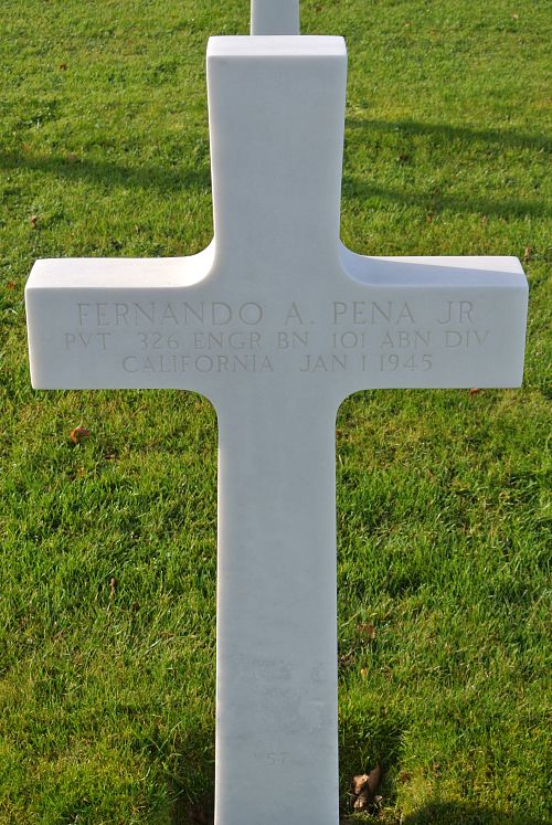 Pvt Fernando A. Pena Jr. enlisted in Los Angeles, California on 20 May 1943.He was first buried at the Temporary American Military Cemetery of Foy, Belgium.