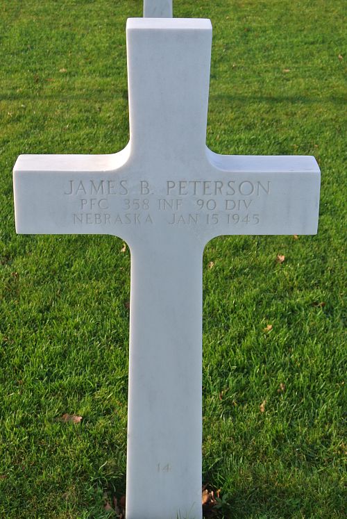 Pvt James B. Peterson graduated from Irving Junior High School in 1942. He had attended the University of Nebraska for a year and had commenced his sophomore year when he left for the army.Pfc James B. Peterson was first buried at the Temporary American Military Cemetery of Foy, Belgium.
