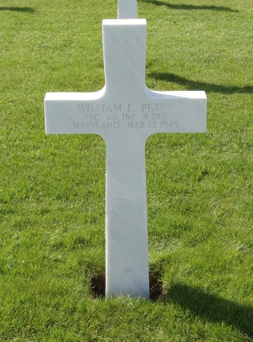 Pfc William L. Petry was a driver before he enlisted at Fort George G. Meade, Maryland on 11 May 1944.Source of information: Peter Schouteten, Carla Mans, www.abmc.gov, www.wwiimemorial.com, www.archives.gov - WWII Enlistment Record, www.ancestry.com - Headstone and Interment Record, www.findagrave.com - Oldnanny, http://9thinfantrydivision.net