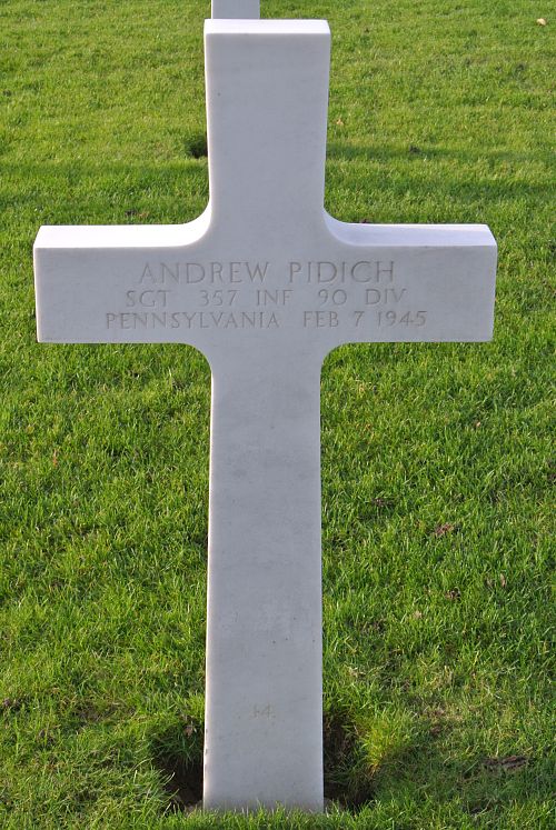 Sgt Andrew Pidich volunteered for the Army of the United States in Wilkes Barre, Pennsylvania on 20 November 1942.He was first buried at the Temporary American Military Cemetery of Foy, Belgium.