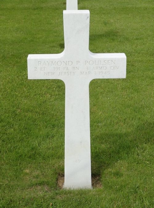 2nd Lt Raymond P. Poulsen was first buried at Temporary American Military Cemetery Henri-Chapelle, Belgium Block WWW, Row 6, Grave 103.Source of information: Peter Schouteten, Carla Mans, www.abmc.gov, www.wwiimemorial.com, www.ancestry.com - Headstone and Interment Record / U.S. City Directories / U.S. WWII Draft Cards Young Men