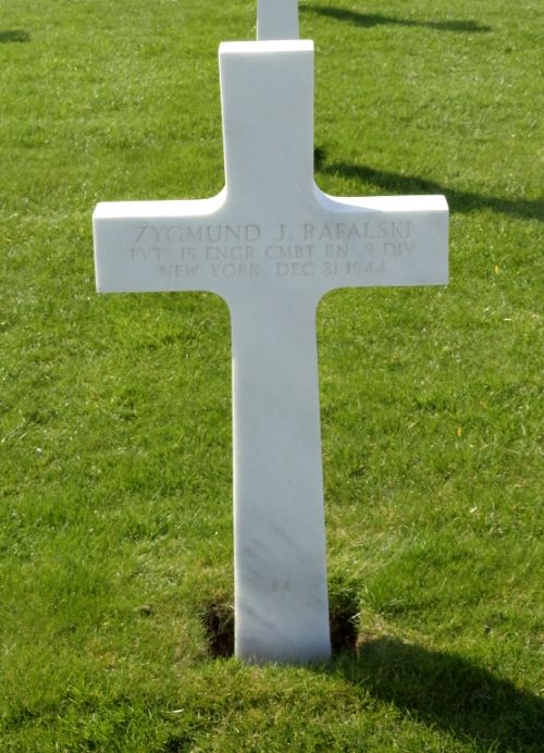 Pvt Zygmund J. Rafalski's parents immigrated from Poland in 1914.He worked as a cook at a hotel in Buffalo when he joined the Regular Army on 7 December 1939 at Fort Dupont, Delaware. He was sent overseas in March 1944 and was wounded in Normandy in June 1944. After being hospitalized for several months he returned to his unit. For this wound he was awarded the Purple Heart Medal a first time.
