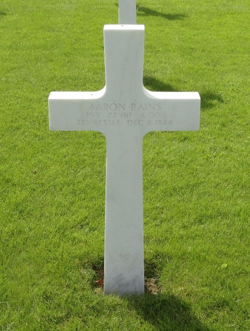 Pvt Aaron Rains worked on a farm before he enlisted at Camp Shelby, Mississippi on 3 April 1944.Source of information: Danny van der Groen, Peter Schouteten, Carla Mans, www.abmc.gov, www.wwiimemorial.com, www.archives.gov - WWII Enlistment Record, www.ancestry.com - Headstone and Interment Record / U.S. WWII Draft Cards Young Men / 1930 Census