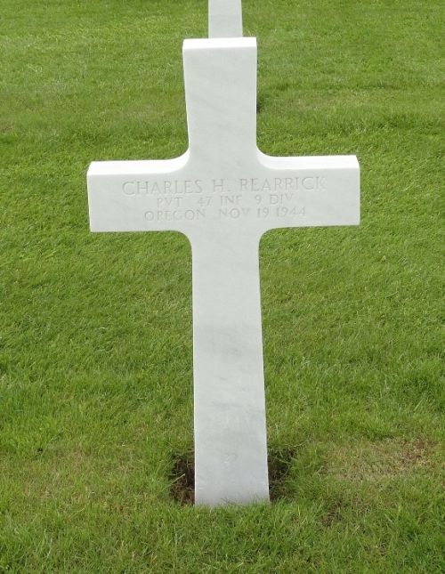 Pvt Charles H. Rearrick was a lumberman before he enlisted at Fort Lewis, Washington on 29 March 1944.Source of information: Peter Schouteten, Sheree Dowdle, www.abmc.gov, www.wwiimemorial.com, www.archives.gov - WWII Enlistment Record, www.ancestry.com - Headstone and Interment Record / 1910/1920/1930/1940/1950 Census / U.S. WWII Draft Cards Young Men, http://9thinfantrydivision.net, www.newspapers.com - The Eugene Guard 23 August 1944