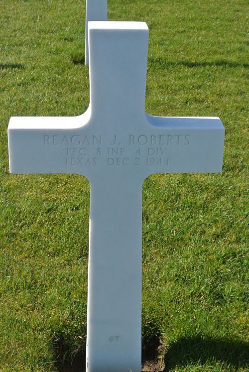 Pfc Reagan J. Roberts enlisted in Los Angeles, California on 29 October 1943.Source of information: Danny van der Groen, Peter Schouteten, www.abmc.gov, www.wwiimemorial.com, www.ancestry.com - Headstone and Interment Record / WWII Enlistment Record / 1940 Census / U.S. WWII Draft Cards Young Men