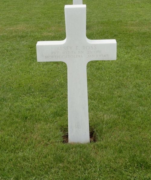 Pvt Alsey E. Ross enlisted on 7 March 1939.His initial burial took place on Foy Temporary American Military Cemetery, Bastogne, Belgium.