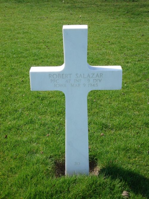 Pfc Robert Salazar was a sales clerk before he enlisted at Camp Dodge, Iowa on 29 June 1943.Source of information: Peter Schouteten, Carla Mans, www.abmc.gov, www.wwiimemorial.com, www.archives.gov – WWII Enlistment Record, www.ancestry.com - Headstone and Interment Record / U.S. WWII Draft Cards Young Men, http://9thinfantrydivision.net