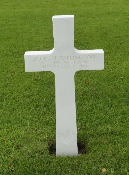 John H. Sappington graduated from South Shore High School and took his training course at Louisiana State University.When Kampfgruppe Muller forced the 3rd Bn. to yield ground, two platoons of Company I, 393rd Infantry joined with Company M to regain the lost ground. They were unable to regain it and were barely able to hold their own in the face of enemy tanks. Four bazooka teams moved forward. A Panther closed on the Company M command post and shot up the Company M mess tent.
