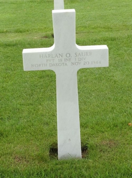 His mother was born in Norway.Pvt Harlan O. Sauer was first buried at Temporary American Cemetery Henri-Chapelle Block X, Row 10, Grave 96.