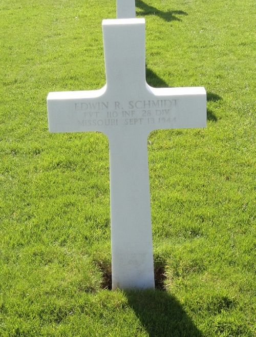 Pvt Erwin R. Schmidt enlisted at Jefferson Barracks, Missouri on 16 December 1943.He was first buried at the Temporary American Military Cemetery of Fosse, Belgium.