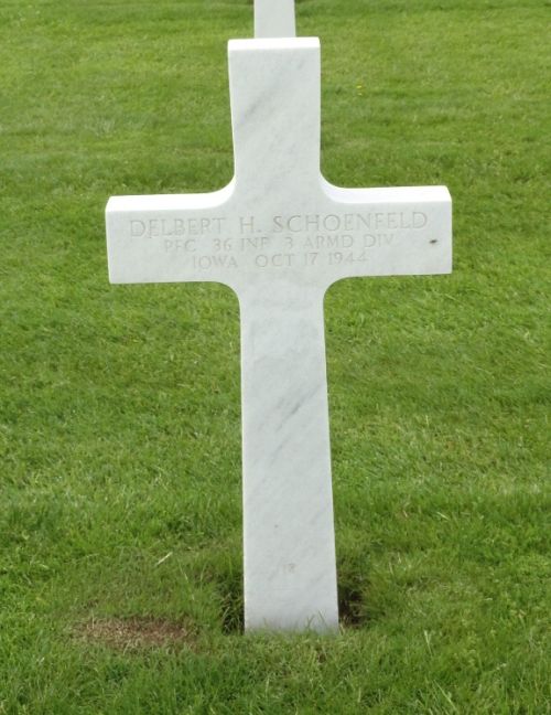 Pfc Delbert H. Schoenfeld enlisted at Camp Dodge Herrold, Iowa on 3 March 1943.He worked on a farm before he enlisted.