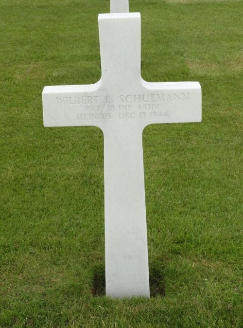 Pvt Wilbert E. Schuemann was first buried at Temporary American Military Cemetery Henri-Chapelle Block FF, Row 3, Grave 43.Source of information: Raf Dyckmans, Carla Mans, www.abmc.gov, www.wwiimemorial.com, www.ancestry.com - Headstone and Interment Record / U.S. WWII Draft Cards Young Men