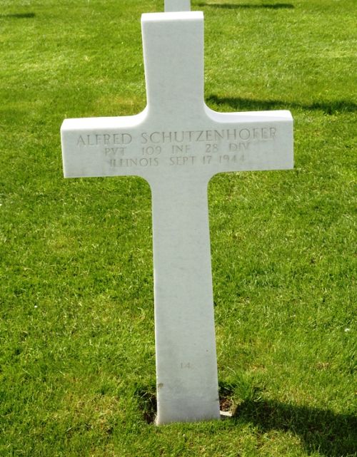 Pvt Alfred Schutzenhofer was first buried at Fosse Temporary American Military Cemetery, Namur, Belgium.Source of information: André Koch, www.abmc.gov, www.wwiimemorial.com, www.ancestry.com - U.S. Headstone and Interment Records for U.S. Military Cemeteries on Foreign Soil