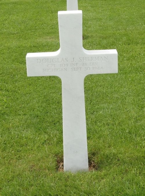 Cpl Douglas J. Sherman enlisted in Kalamazoo, Michigan on 8 January 1943.He was married to Georgia K. Sanford on 12 August 1939, at Grand Rapids, Kent County, Michigan.