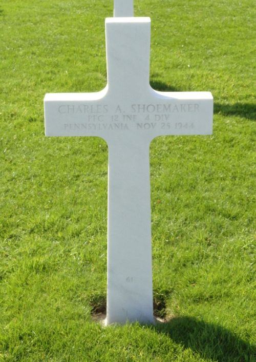 Pfc Charles A. Shoemaker enlisted in Greensburg, Pennsylvania, on 1 June 1943.Source of information: Danny van der Groen, Peter Schouteten, Astrid van Erp, www.abmc.gov, www.wwiimemorial.com, www.archives.gov – WWII Enlistment Record, www.ancestry.com - Headstone and Interment Record / 1940 Census, www.fold3.com - WWII Draft Card