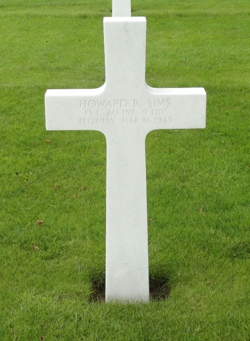 Pvt Howard R. Sims was a driver before he enlisted at Camp Blanding, Florida on 17 January 1944.Source of information: Peter Schouteten, Carla Mans, www.abmc.gov, www.wwiimemorial.com, www.archives.gov - WWII Enlistment Record, www.ancestry.com - Headstone and Interment Record / U.S. WWII Draft Cards Young Men / 1920 Census, http://9thinfantrydivision.net