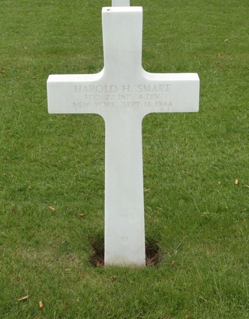 Pfc Harold H. Smart joined the Regular Army in Syracuse, New York on 16 October 1940 and spent 37 months in Panama before he was sent overseas in the spring of 1944.He was first buried at the Temporary American Military Cemetery of Fosse, Belgium.