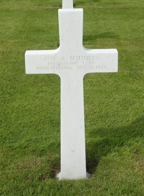 Pfc Roy A. Souders was a machinist apprentice before he enlisted in New Cumberland, Pennsylvania on 27 March 1944.Source of information: Peter Schouteten, Sheree Dowdle, www.abmc.gov, www.wwiimemorial.com, www.archives.gov - WWII Enlistment Record, www.ancestry.com - Headstone and Interment Record / U.S. City Directories, 1822-1989 / 1910/1920/1930 Census / U.S. WWII Draft Cards Young Men, http://9thinfantrydivision.net